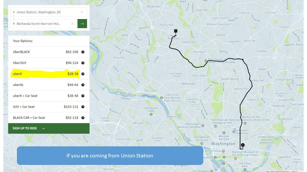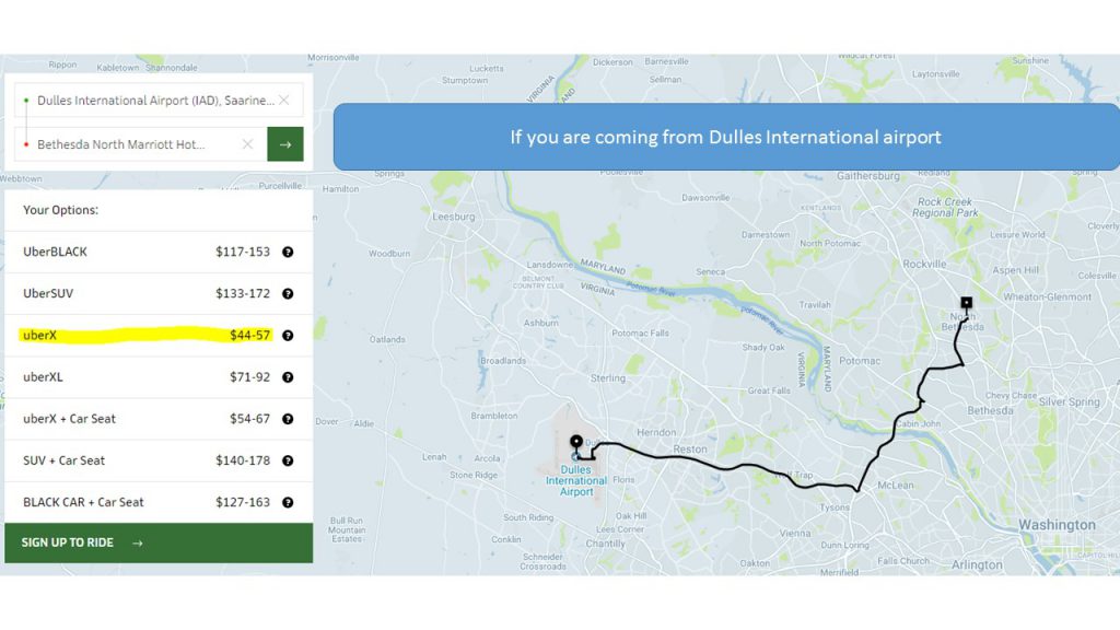 If you are coming from Regan National Airport (use Blue Line going toward METRO CENTER) or from Dulles Internaltion Airport (use Silver line) you need to change train (Red Line) at Metro Center going toward “Shady Grove”; Leave metro on White Flint metro station and across the road is Bethesda North Marriott Hotel.