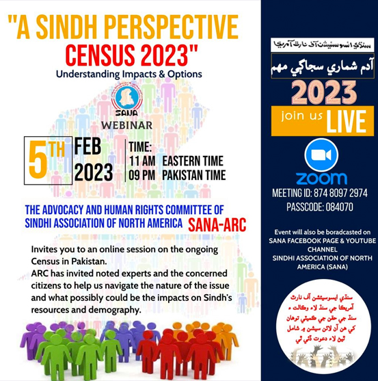 Mr. Naseer Memon, a Consultant Climate Change, Disaster Management, Livelihoods and Resettlement * to the influx of people from neighboring countries and impact on demography of sindh. SANA- ARC conducted a successful Zoom Webinar on 5th February 2023. Distinguish speakers from Sindh highlighted main issues related to census 2023 schedule to being from March 2023. Mr. Fazalullah Qureshi former chief economist of Pakistan, chief executive federal bank of cooperative, Chairman National Tariff Commission, Federal Secretary Planning & Development, and Secretary Statistics Division. Pointed out serious issues related to the census being healed five years earlier then the actual time.