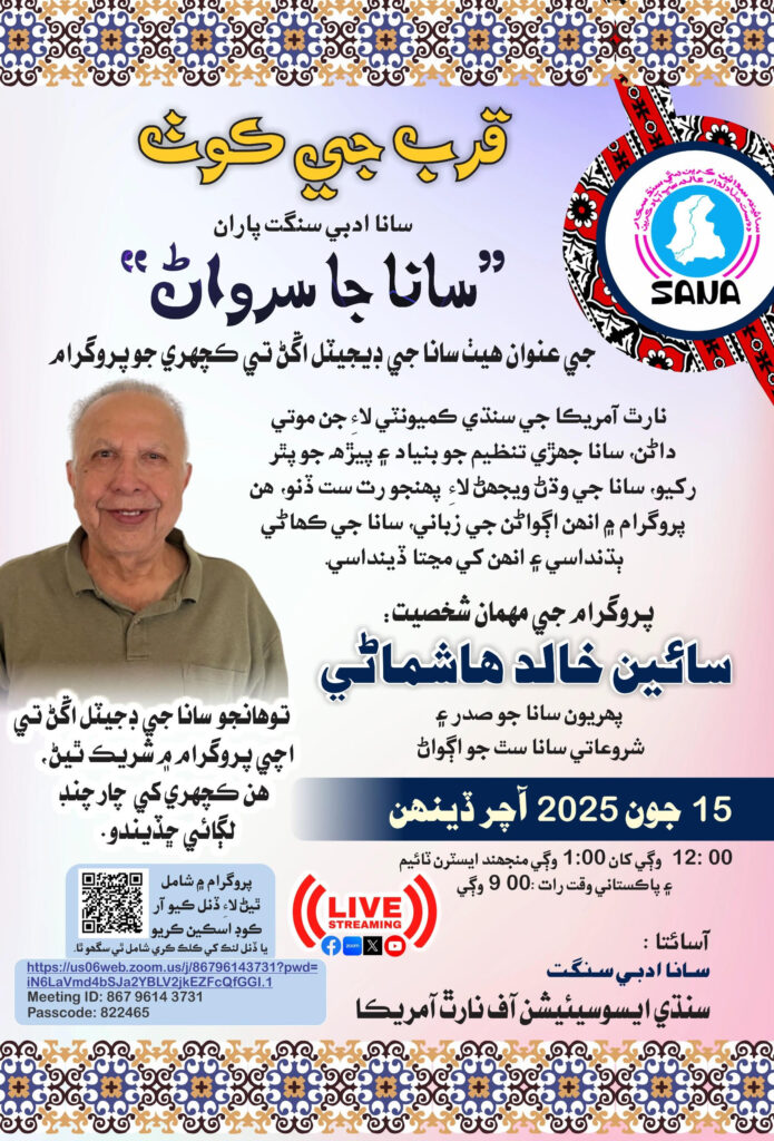 نارٿ امريڪا جي سنڌي ڪميونٽي لاء جن موتي داڻن, سانا جهڙي تنظيم جو بنياد ۽ پيڙهه جو پٿر رکيو, سانا جي وڌڻ ويجهڻ لاء پهنجو رت ست ڏنو, ان پروگرام ۾ انهن اڳواڻن جي زباني, سانا جي ڪهاڻي .ٻڌنداسين ۽ انهن کي مڃتا ڏينداسين